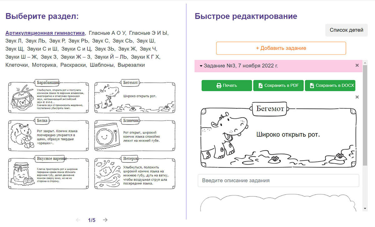 "Генератор логопедических заданий" поможет подготовить задание на дом за 1 минуту: для работы над артикуляционной и мелкой моторикой, постановки и автоматизации звуков, развития звуко-буквенного анализа.