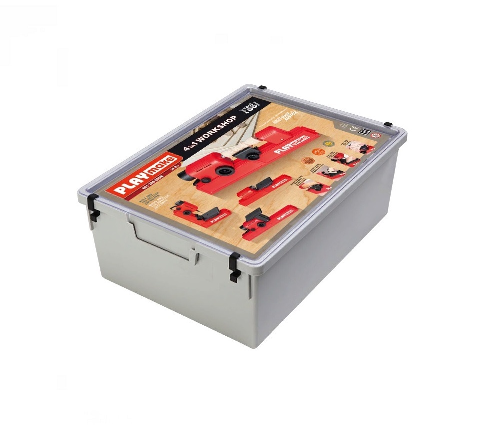 PLAYmake 801200EDUR (4 в 1) это конструктор для сборки станков для обработки древисины, представляет собой набор комплектующих для самостоятельной сборки 5 вариантов станков, следующего типа: токарный станок по дереву; лобзик; шлифовальный станок; ручная дрель по дереву; сверлильный станок по дереву. Каждый станок - это полноценное работающее устройство. Отличительной особенностью является возможность одновременной сборки из одного набора сразу двух вариантов разных полноценно работающих станков. Сборка и перекомпановка станка PLAYmake превращается в увлекательную игру для детей, поскольку производится всего лишь с помощью отвертки, входящий в комплект поставки.