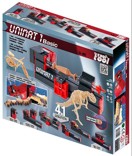 Конструктор профессиональных станков в миниатюре позволяет создать настольную столярную мастерскую: используя его детали и модули, можно работать по дереву на токарном станке, шлифовальном станке, электролобзике, настольных и ручных сверлильной и шлифовальной машинках. Все оборудование серии Unimat1 Basic приспособлено для использования детьми младшего и среднего школьного возраста (начиная с первого класса) на уроках технологии. Собирая станки, по размеру сопоставимые с листом А4 и вместе с тем дающие адекватное представление о работе с изделиями, учащиеся развивают навыки конструирования и приобретают самые разнообразные технические компетенции. 1) Мини-дрель. Оборудование позволяет устанавливать сверла диаметром от 0,5 до 6 мм. Этот инструмент отлично подходит для сверления дерева, акрила и тонкого металла. 2) Лобзик. Электрический лобзик предназначен для пиления фанеры, древесины, пластика, тонких листов из мягких металлов. 3) Токарный станок по дереву. Расстояние между центрами 13,5 см и наибольшая высота центра 5 см обеспечивают удобную работу станка с приводом 12 В. 4) Шлифовальный станок. Закрепленный на станине электропривод с вращающимся диском и наждачным кругом обеспечивает финишную обработку поверхностей, а также заточку инструмента. Все инструменты обладают достаточно небольшой мощностью и минимальными расстояниями между деталями на рабочей поверхности, а значит, они безопасны для использования учащимися. В комплекте также набор технологических карт и пособие для учителя.