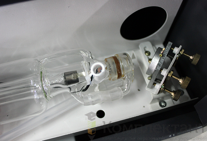 Рабочий стол имеет параметры 40х40 см. На станок установлен контролер М2 и лазерная трубкой мощностью 50 Вт. В оптическую систему входят три зеркала и линзы. В качестве охлаждающей системы выступает водяная помпа, которая предохраняет от перегрева. Для обеспечения бесперебойного охлаждения необходим чиллер.
