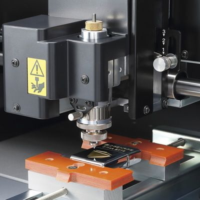 Можно установить специальный наконечник на шпиндель для автоматического контроля изогнутой поверхности, что обеспечит точное соблюдение глубины гравировки.