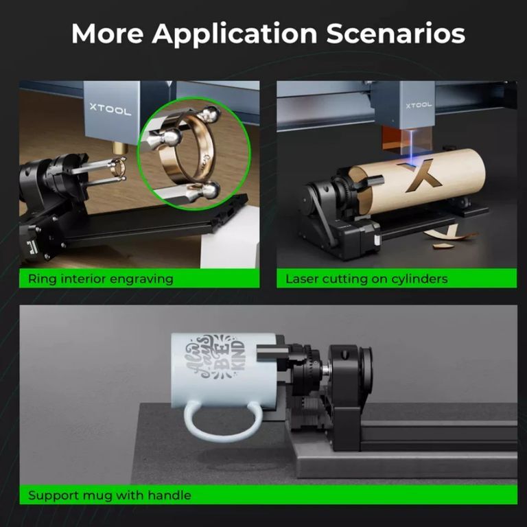 Насадка для гравировки цилиндрических и криволинейных поверхностей на гравировщике Xtool P2 от Makeblock. Различные варианты сборки позволяют гравировать большое количество цилиндрических поверхностей.