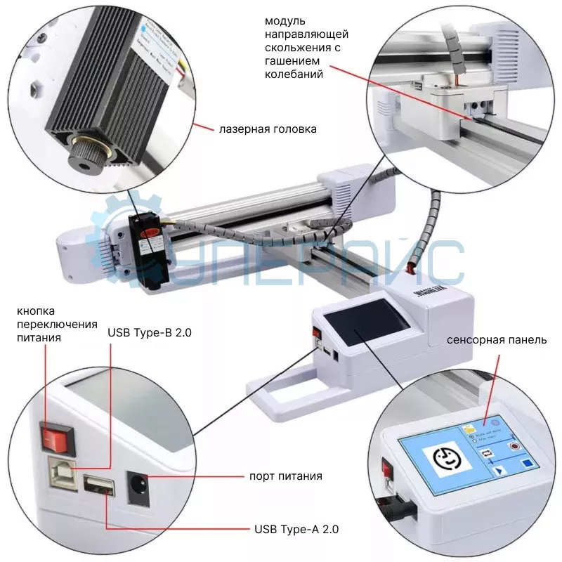 источник питания - 1 шт USB-кабель для передачи данных - 1 шт USB-диск (содержит драйвер, ПО, электронное руководство) - 1 шт сенсорная ручка для панели управления - 1 шт защитные очки с защитной линзой - 1 шт крафт-бумага - 1 шт инструкция по эксплуатации - 1 шт |