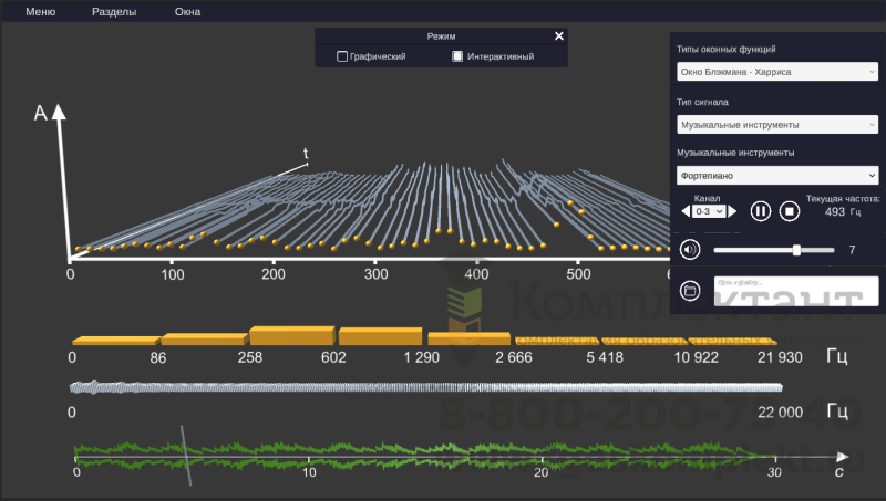 Демонстрация акустического сигнала в виде спектрограммы и осциллограммы с возможностью изменения оконной функции (оконное преобразование Фурье)